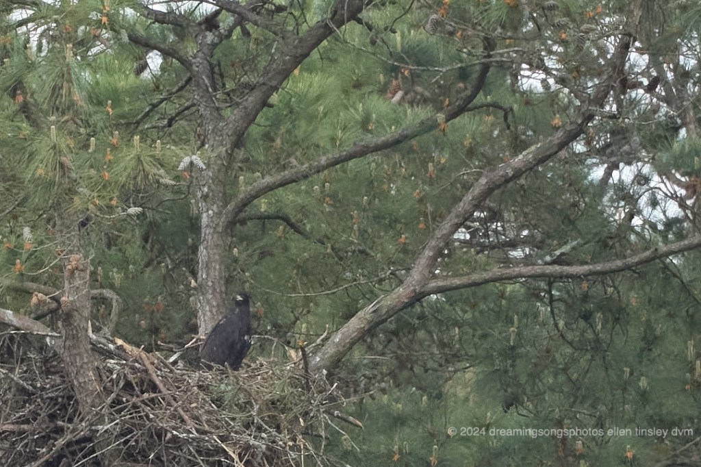 Jordan Lake. First Nest. This morning I managed to see the chick in the nest. It’s a little difficult to tell where the chick is so in the second photo I drew a circle around it. The chick is facing us. In the third photo you can see Dad Bart. He is preening hard! I did see Mom Kate but she went by so quick I didn’t get a photo of her.