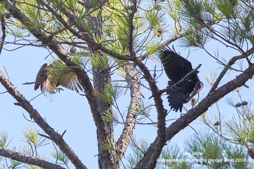 I believe this is an immature Cooper’s hawk who zipped past me and into the far pine trees.