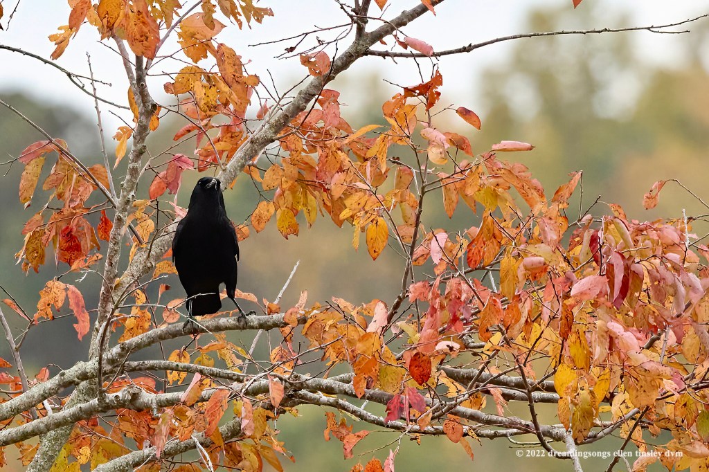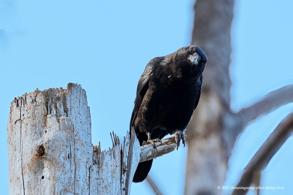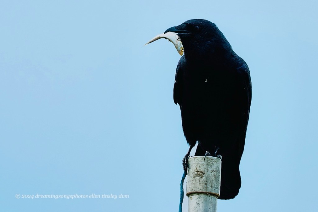 This American crow was quite delighted as he perched upon the pipe and presented his breakfast goodie for my examination. The presentation did not last long however before he flew up and into the trees where the rest of the crow clan could not steal it from him.