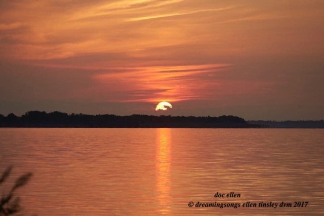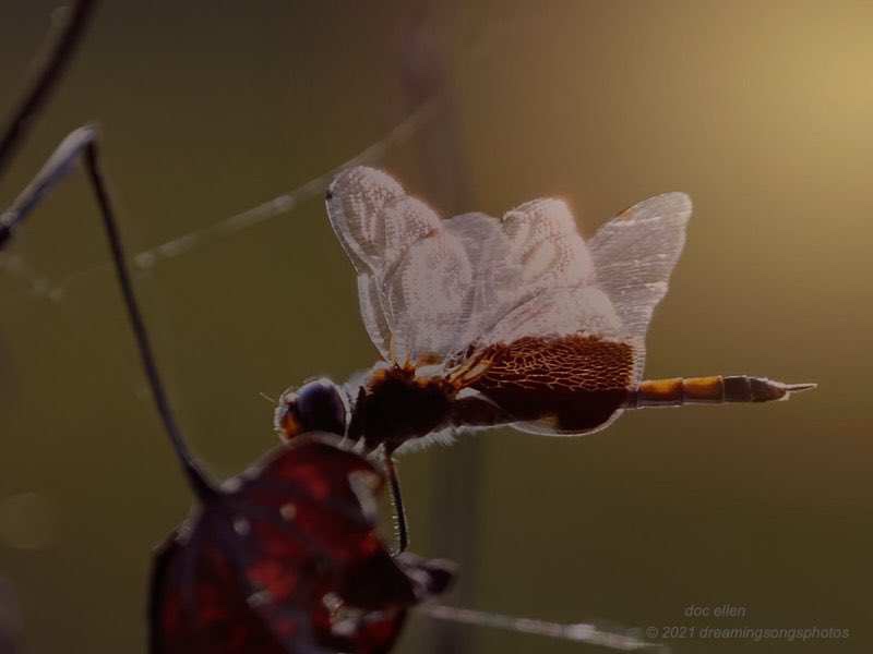 Jordan Lake. As the day’s heat leaves the sky, dragonflies come to rest on a favorite perch for the night. Like this saddleback dragonfly, may you too find a safe haven for your needed rest this night. Peace and Grace, Doc Ellen.