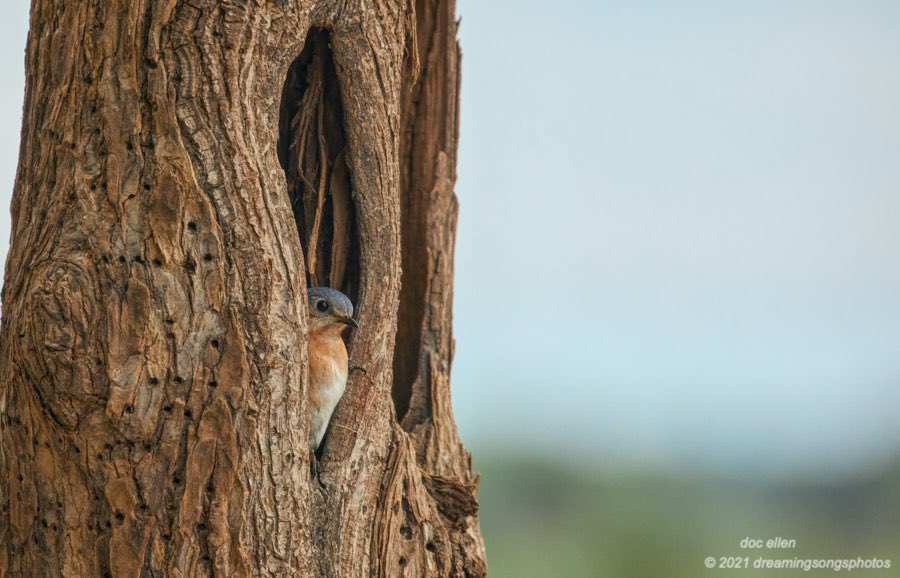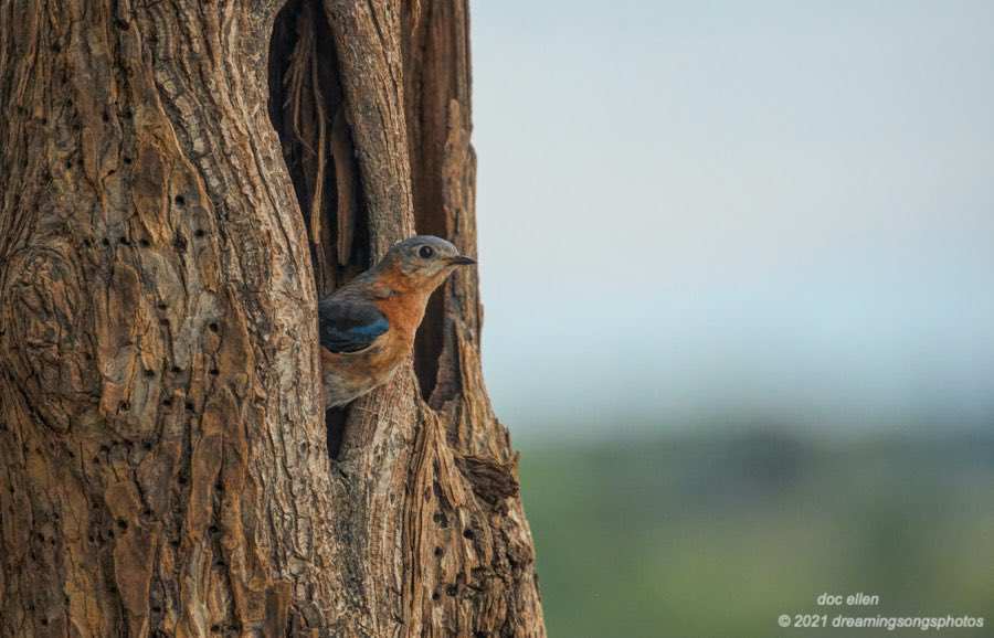 Jordan Lake: often when I am out monitoring bald eagles, I have time to watch other birds too. This pair of eastern bluebirds have selected a tree cavity for their nesting season. I am always delighted when I can find a cavity breeder such as the eastern bluebird using a natural tree hole for their nest placement. Don’t get me wrong … the bluebird population was saved in part by the efforts of many a birder who placed bluebird boxes about their property and gave these thrushes a place of safety for their families. Natural cavity or bluebird box: these small birds make use of what they can claim for their home!