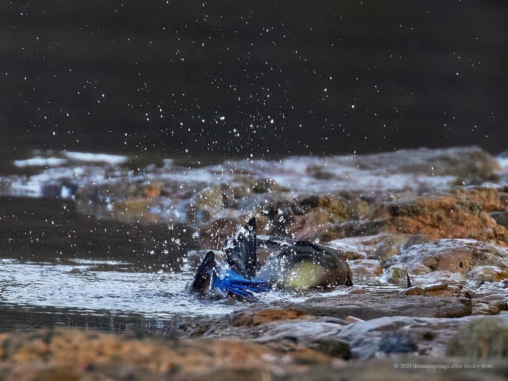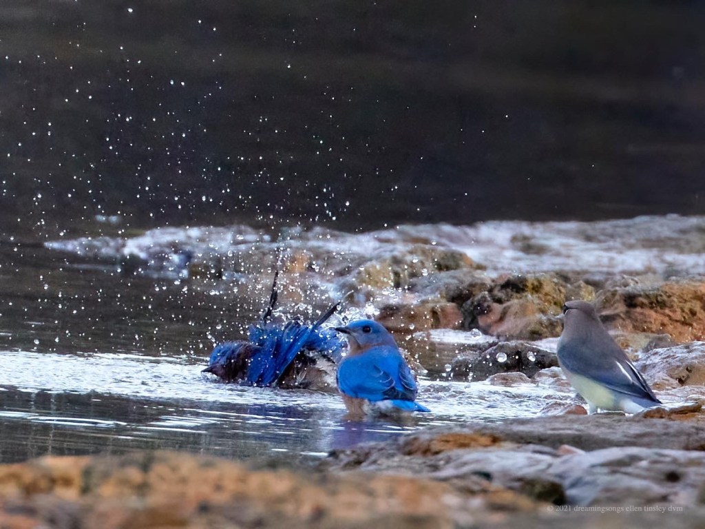 Jordan Lake. The air temperature was 40°F. Birds are meticulous about staying clean. I would not want to jump in the lake with the air that cold and water temperature of 50°F, but both the eastern bluebirds and the cedar waxwing (to the right) did just that! They enjoyed their baths. Brrr!