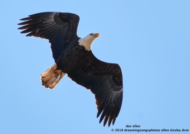 The year-old bald eagle to the far right has a small fish in its talons that it just caught.