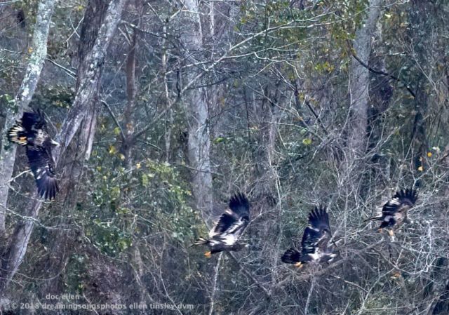 The 3 immature eagles behind the 1-year-old bird want to steal the fish.