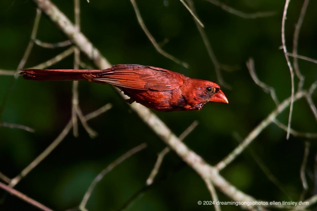 The male northern cardinal tries hard to look quite classy at all times. However, as you can see here, he is very disheveled. Molt, the normal replacement of feathers, in cardinals occurs in late summer. His only way foreword is to preen and wait for the new feathers to appear. Soon he will again be crimson elegant, beak to tail.