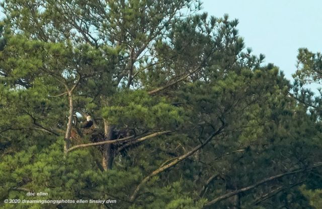 Kinda hard to see, but the two dark lumps at the brim of the nest and between Mom Godiva and the trunk are chicks.