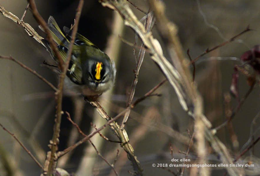 Here is the other kinglet. A ruby-crowned kinglet popping his ruby-crown at me when I startled him.