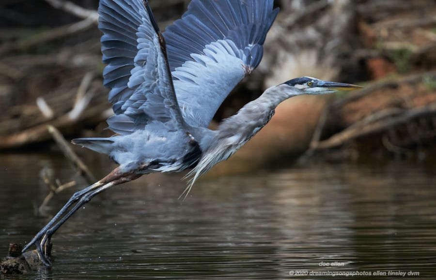 Jordan Lake, Haw River: Feathered Kinetic Energy smoothly surges from the toes through to the sharp beak as this great blue heron launches and displays that energy that is possessed by a body because of its motion. The physics of kinetic energy explained by a single bird.