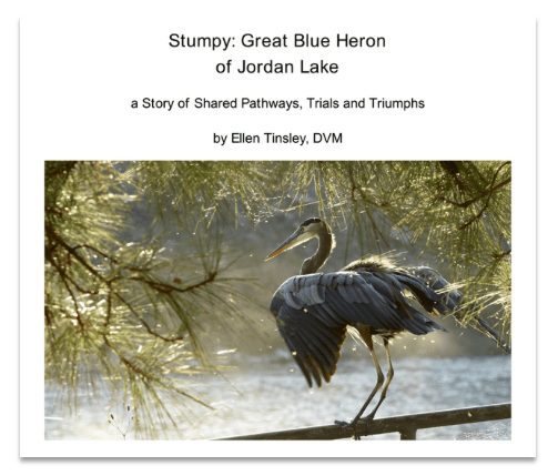 2nd book is Stumpy: Great Blue Heron of Jordan Lake. True story of the healing journey shared by Stumpy, a great blue heron of Jordan Lake, and me. Both Stumpy and I found ways to cope with injuries and continue to explore life. Contains 58 original photographs. 116 pages. Go here to preview or purchase.