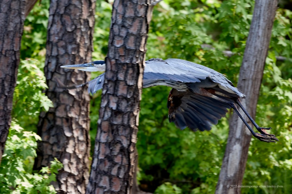 Jordan Lake. I am used to seeing the great blue heron – standing tall and still as a statue – as it waits to catch a fish, that I find myself quite fascinated when I can photograph one in-flight through the trees. It always makes an interesting composition. I hope you agree!