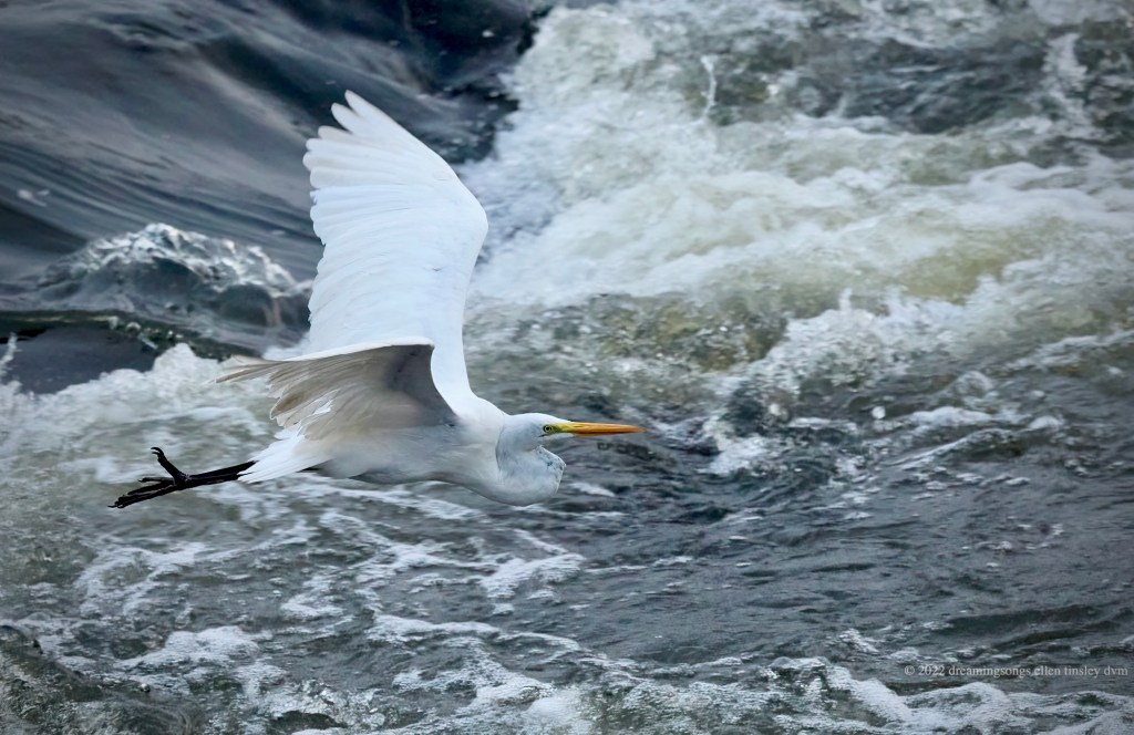 Jordan Lake. The great egret came floating in about 50 feet above the water when it suddenly headed down and started to dance on the surface. He was looking hard to his left but I couldn’t see what had his attention. He danced a moment or two and then headed back to the shoreline.