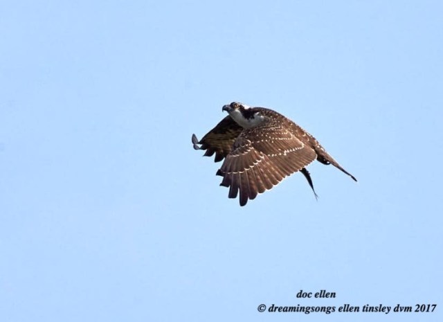 This fledgling osprey has a nice sized fish dangling below her wing and her “rivets” are glowing.