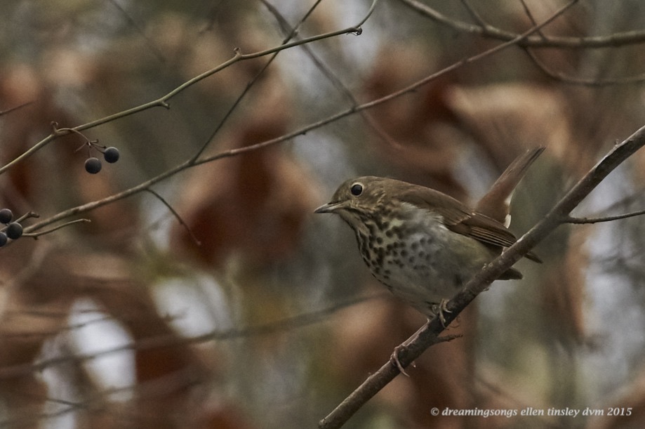 This hermit thrush was a welcome sight against the bare winter tree limbs.