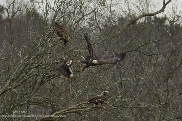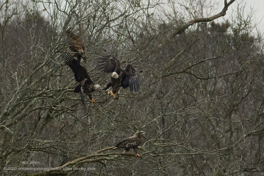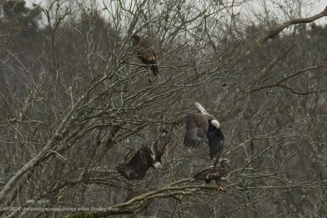 CHALLENGE for a rainy Friday evening! There are 26 bald eagles in this photo I made this morning from the MID-POINT of the riprap. Can you find all 26 of them in the photo? If you go to the lake to look, remember that MID-POINT distance because if you go further down the river riprap, the eagles will go further down river and you won’t get to see the glory of the Gathering. Keep at least 330 feet – a football field distance – away from non-breeding bald eagles. Take your chair, sit, wait, the eagles will come to you. Thank you for your patience and good seeking for the 26 eagles!!!