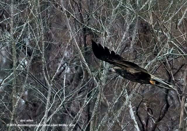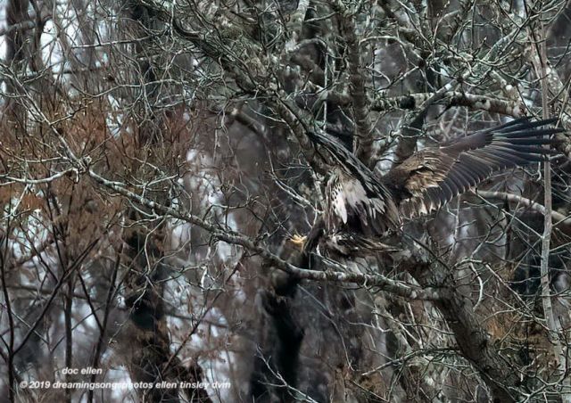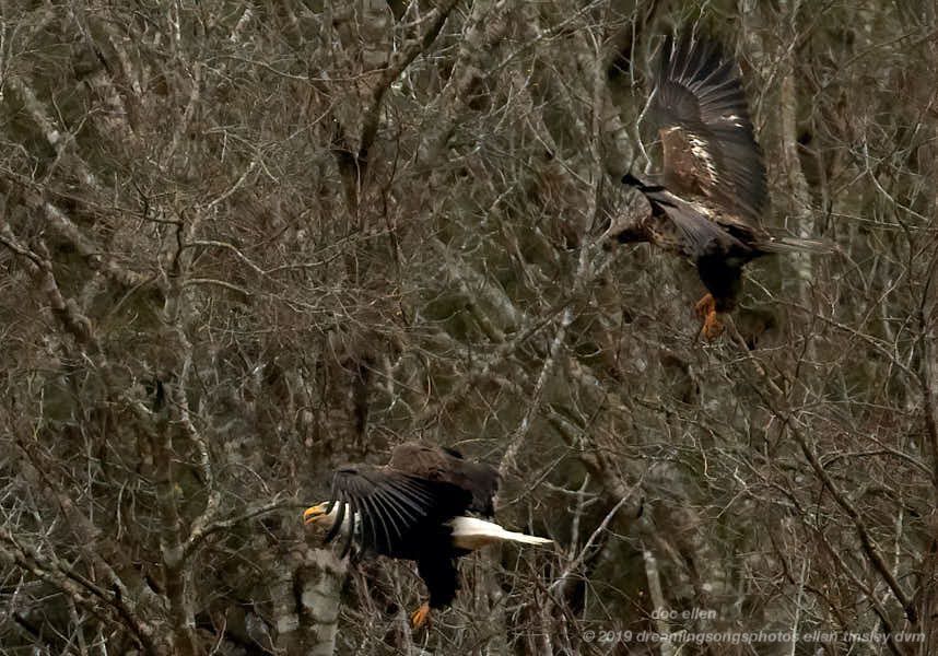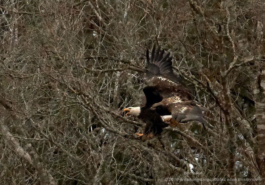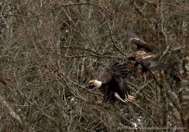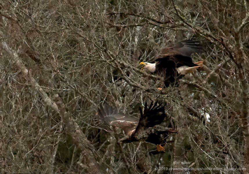 The eagle was gaining on the osprey when an adult bald eagle broke up the chase.