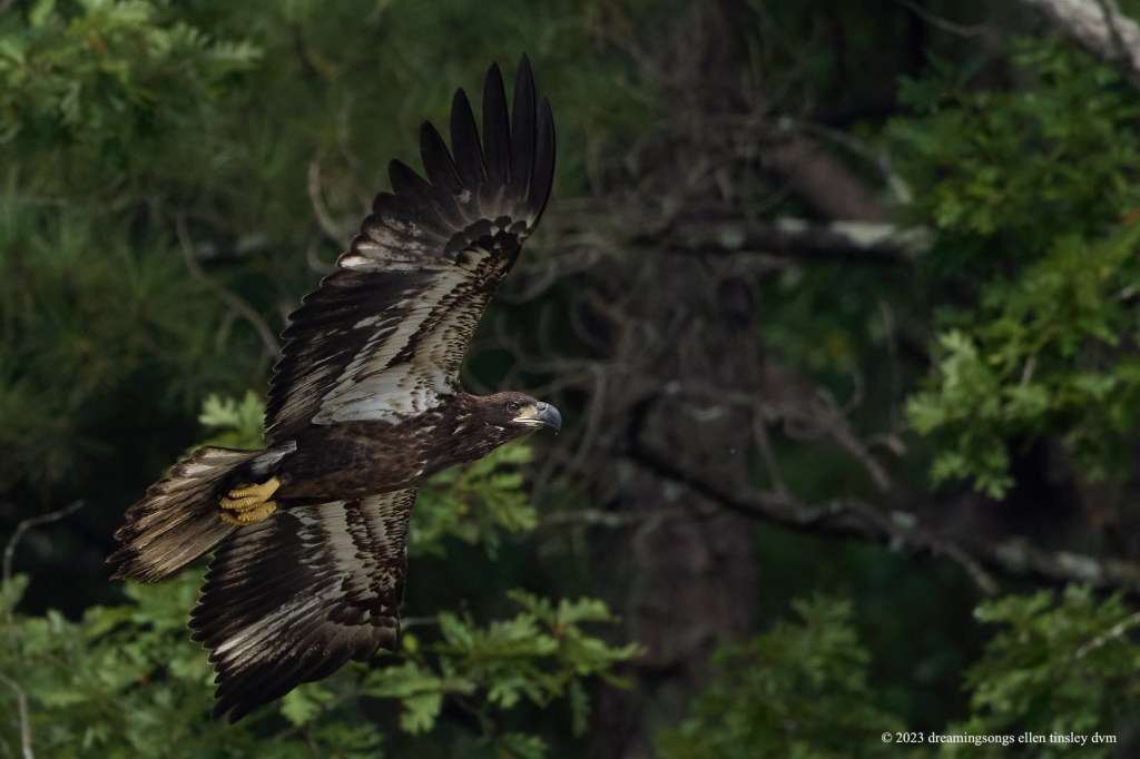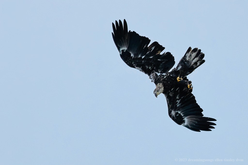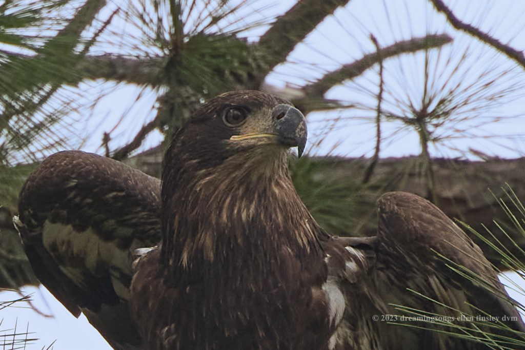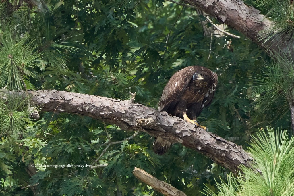 Jordan Lake: The turkey vulture on the ground on the left is looking sadly down at the spot were there had been a piece of fish. Another vulture had just launched taking that piece with it. Then Captain Doug and I both spotted the bald eagle fledgling on the log as it watched the food morsel rapidly leaving their area. Alas.