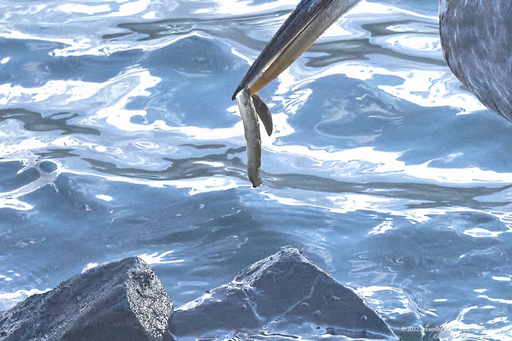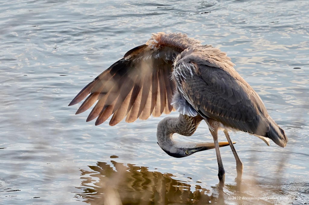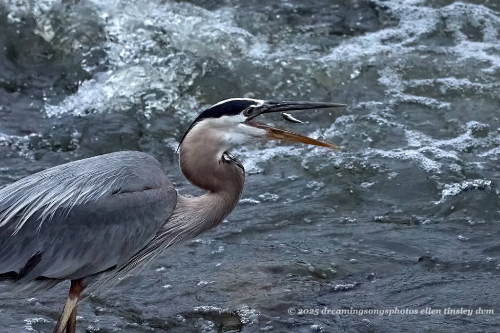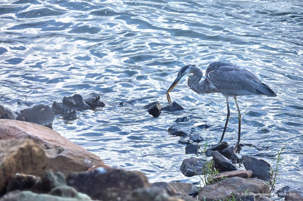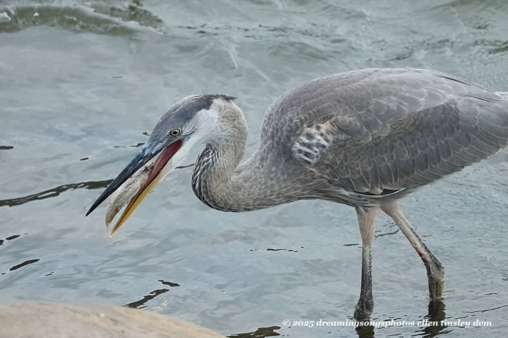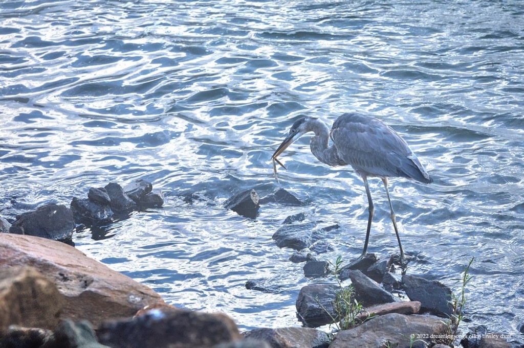 If you have a moment, I can show you how to tell a fledgling great blue heron from an adult. The quickest way to tell the age is to check the head! The adult has a head crowned with a white stripe that is enclosed in a black stripe and often a plume or two off the backside of the crown. The fledgling has a solid gray-capped head. It has no plumes. There is a big color difference in the body feathers too. Light pearl gray youngster and adult deep slate gray. There are other differences but for standing at the riprap and trying to decide is that a baby or is that an adult remember: it’s pretty much all in the head.