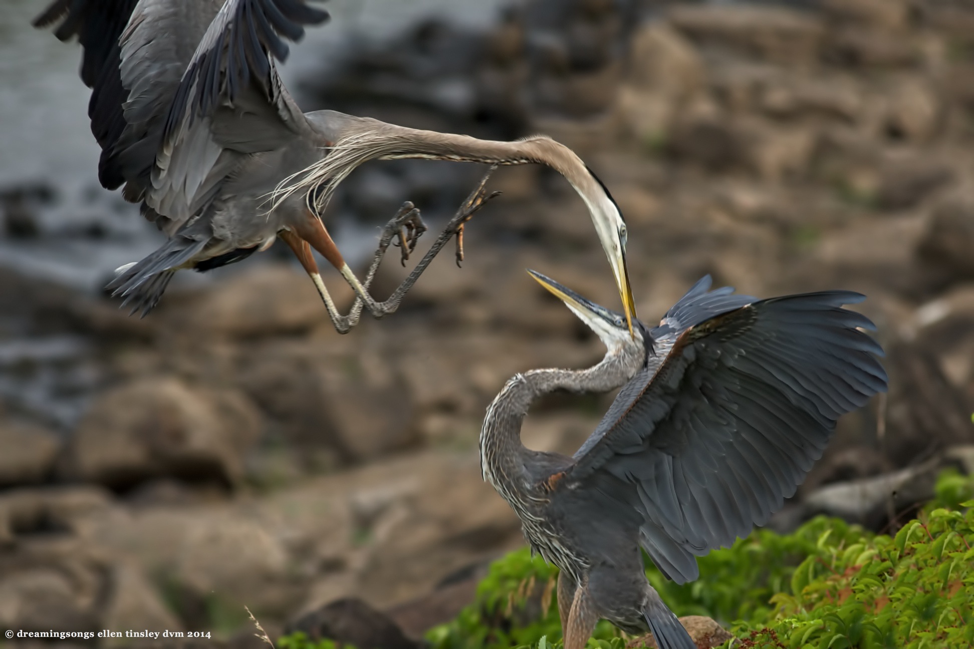 heron dispute By neighdoctor June 27, 2014 heron dispute The great blue heron in the air is an adult; the great blue heron on the ground is immature. The youngster got caught infringing on the adult’s territory. The youngster lost a single small feather from his head…and his dignity was sorely bruised. 35.712584 -79.036254