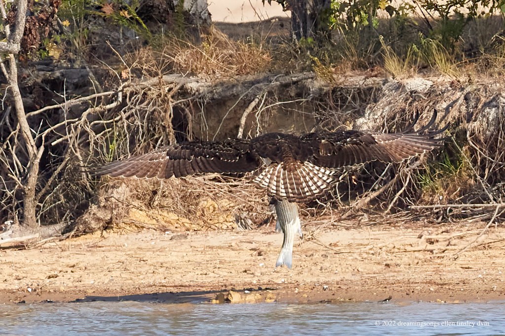 Jordan Lake. This fledgling osprey has only been flying about eight weeks. She managed to catch and carry a striped bass that is as long as she is. She never got more than about 2 feet above water. After resting on the log for three minutes she managed to lift the fish one more time and disappeared around the tree line from my sight.