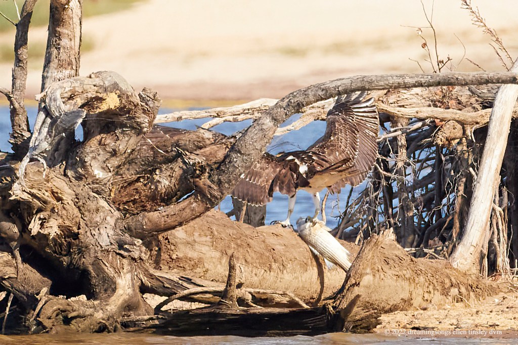 Jordan Lake. The rushing Haw River continues to escape the dam. The morning golden hour was fading away. This fledgling osprey caught itself a catfish. I caught the reflection of both bird and fish.