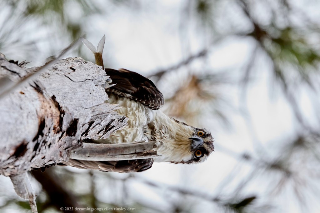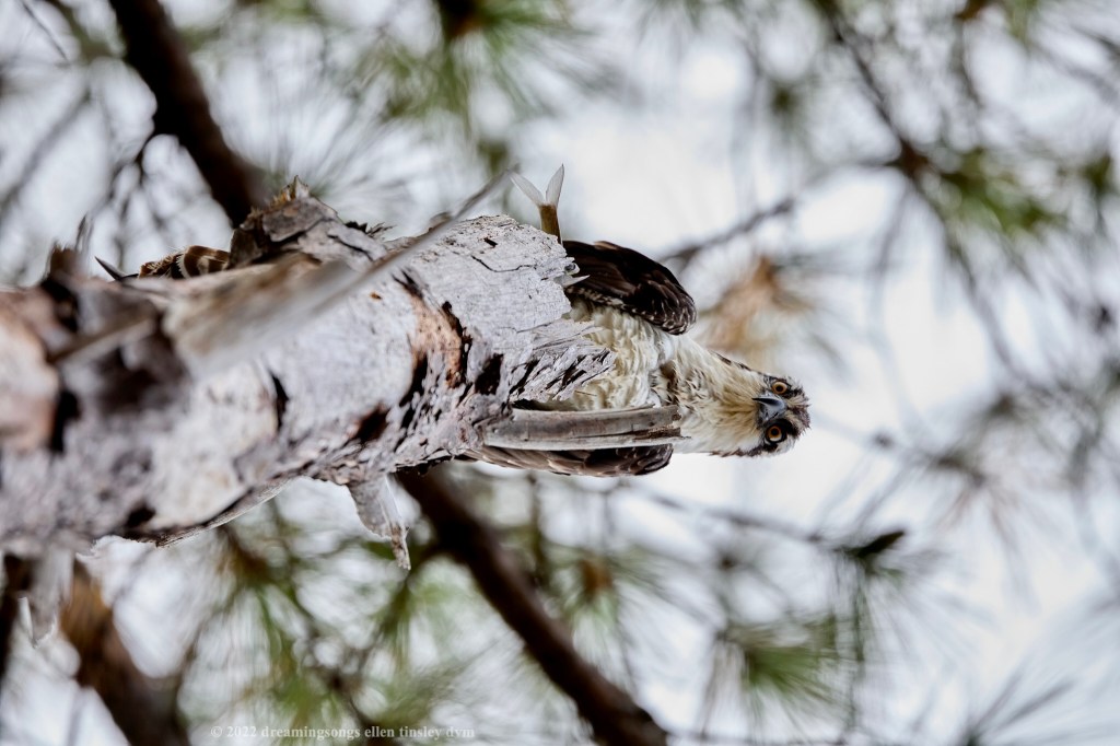 Jordan Lake. You could say this pair of photos were literally “top” of my morning. Yes, the fledgling osprey is looking straight down the tree trunk at me and three other birders who were watching her. I leaned carefully back and pointed my camera straight up at her hoping she wouldn’t bolt! Don’t miss the fish she’s holding!