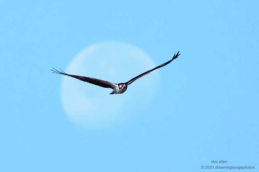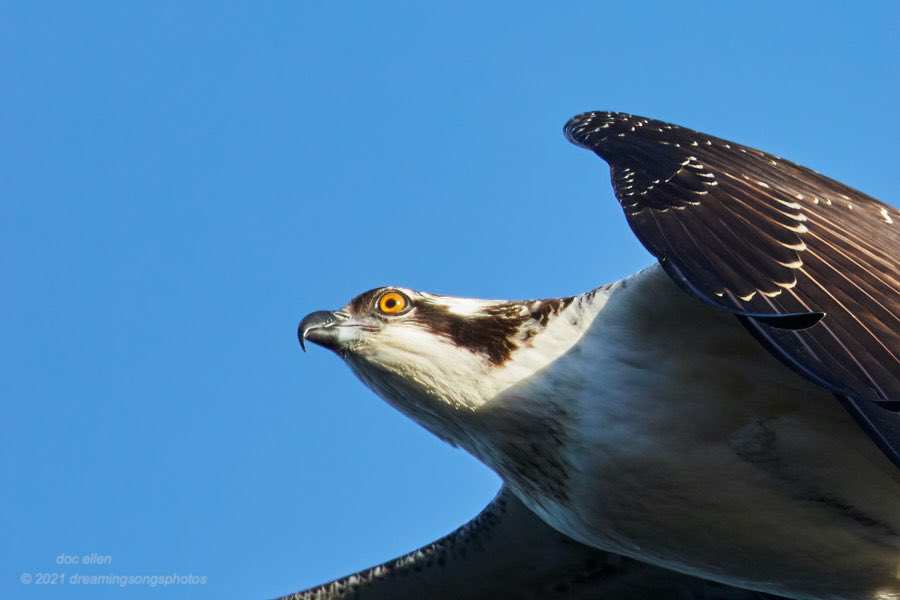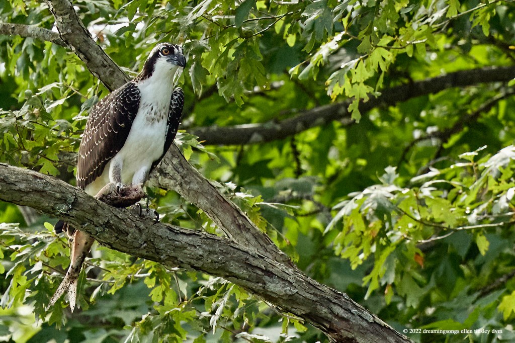 Jordan Lake. While cruising with Captain Doug, from far off we could see a huge fish under the talons of an osprey fledgling. She was quite proud of the fish. Captain Doug got us around to where we could see the Osprey’s front. The fish’s head is missing. Most likely one of the parents caught the fish, removed the head and then gave the carcass to her daughter.