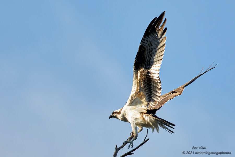 Jordan Lake: the autumn migration of the ospreys is nearing a close. Most of the adult ospreys have already left for South America. This fledgling male osprey had been fishing with great enthusiasm near one of the ramps yesterday when he took a break and let me marvel at his neat precise landing. The latest I have seen ospreys at Jordan Lake is early November. Plan a trip to the boat ramp nearest to you or to the Jordan Lake Dam and watch as the youngsters work to gain muscle and perfect flying and fishing skills for their upcoming trip to South America.