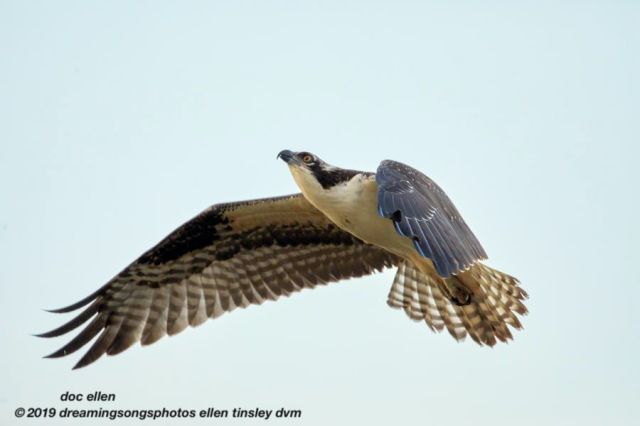 Osprey’s often get rather messy down their chests when they are eating their fish. One way that an osprey can quickly clean his front is to skip across the water, chest parallel to the surface, and at very high speed scrape clean his front, lickety-split. All ospreys do this – but you have to recognize the difference in the dive as they head for a cleaning session if you want to try to catch the action. This fledgling skipped 5 times before going aloft.