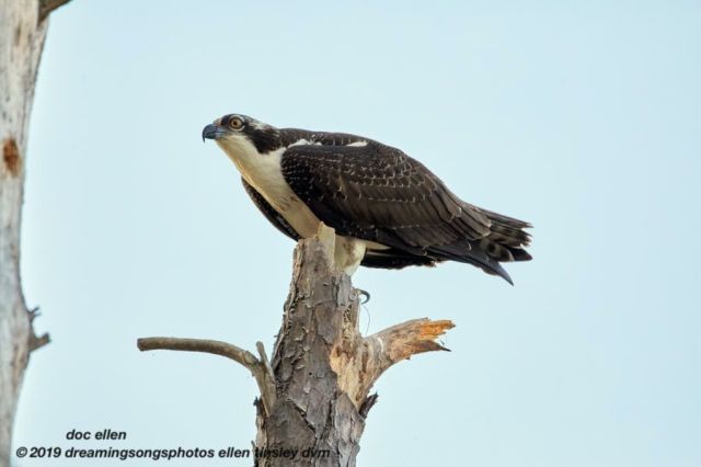 The fledgling male osprey had caught a fish so big that even a mature female osprey (who are bigger than the males) would have had trouble getting the catch back to a tree. And, there is the ever present danger of a bald eagle looking for a fish to steal.