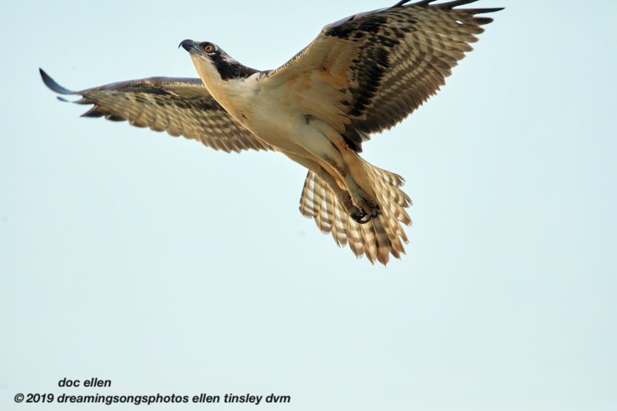 Osprey’s often get rather messy down their chests when they are eating their fish. One way that an osprey can quickly clean his front is to skip across the water, chest parallel to the surface, and at very high speed scrape clean his front, lickety-split. All ospreys do this – but you have to recognize the difference in the dive as they head for a cleaning session if you want to try to catch the action. This fledgling skipped 5 times before going aloft.