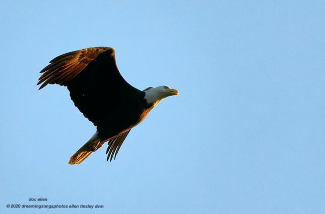 Jordan Lake Dam, Haw River: Aa I photographed this bald eagle, flying towards the rising sun this morning, I found myself thinking about this afternoon and its promise of possibilities: the possibility to once again gather in small groups, the possibility to be responsible in our distances within those groups, the possibility to protect others by wearing our masks. It is hard, as a social species, to be apart and not gather and hug and hold each other. But, we humans can do what the bald eagle cannot: we can thoughtfully make decisions and then live by them. I am waiting as patiently as possible – to know that all of you are safe and healthy. So, go into this afternoon, rejoice and know that this is a first step. Peace and Grace, Doc Ellen