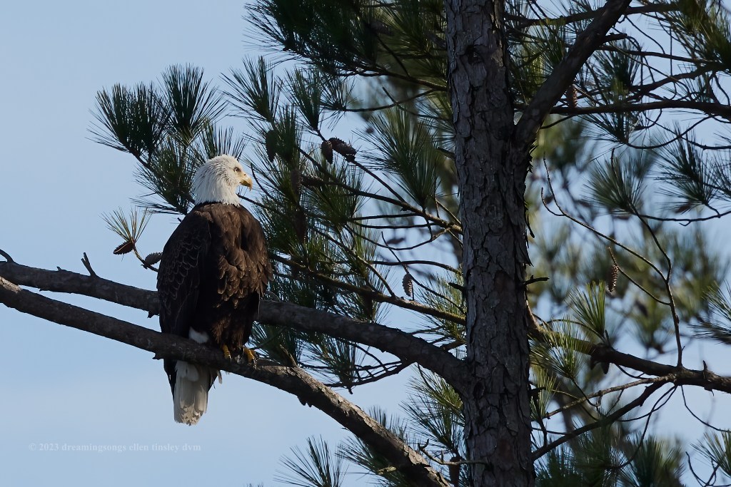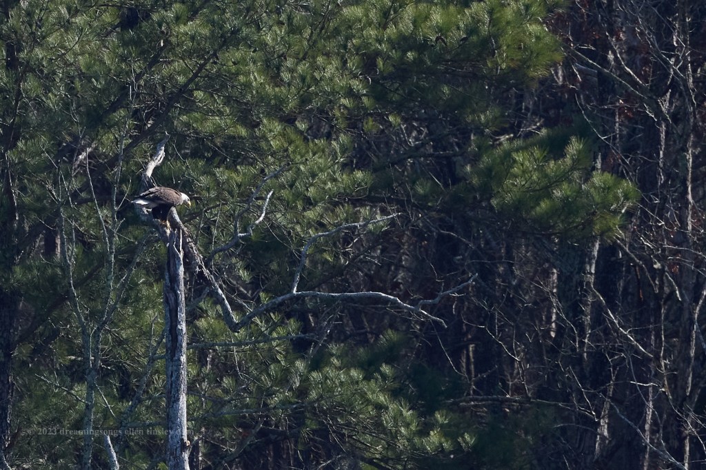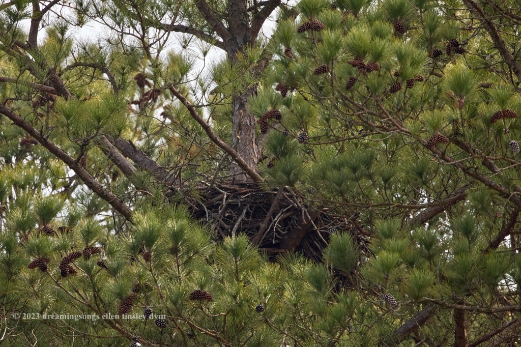 Jordan Lake. We have not seen Dad Pitch or Mom Loblolly in their nest for a week. No eggs in the nest. Have not had a recent closeup of Pitch to know how his injury is doing. All of this means that this breeding season for this pair of bald eagles has ended without any chicks. I honestly do not know why there were no eggs laid: some possibilities could’ve been marauding immature eagles or the injury to Dad Pitch or interference caused by visitors or a combination of those or other factors. If I see Dad Pitch again close enough to know how he is doing I will definitely let you know. In the meantime we can all hold onto our thoughts, prayers and meditations for the next breeding season starting in December. Thank you again for all your love, concern and vast amounts of energy, in so many ways, in your efforts to provide Loblolly and Pitch the best of protection by trying to get the gate to shelter eight closed. Peace and grace, Doc Ellen