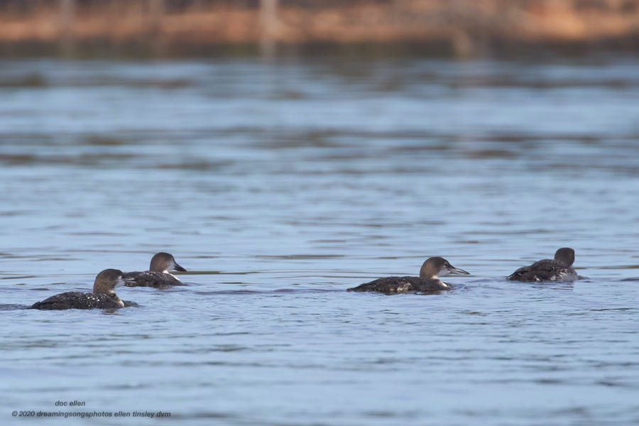 Captain Doug and I were on the lake, checking bald eagle nests and enjoying the beautiful autumn day. We came upon a small flock of common loons who were also enjoying the warmth. Loons are winter visitors here and their lovely calls can be heard in the early mornings and late evenings. Captain Doug tried to ease in front of the loons so I could get some face shots, but, the loons easily grouped, turned direction and then lined out and left us behind. They are fast swimmers and they left me and the little iPhone behind a couple of times too!
