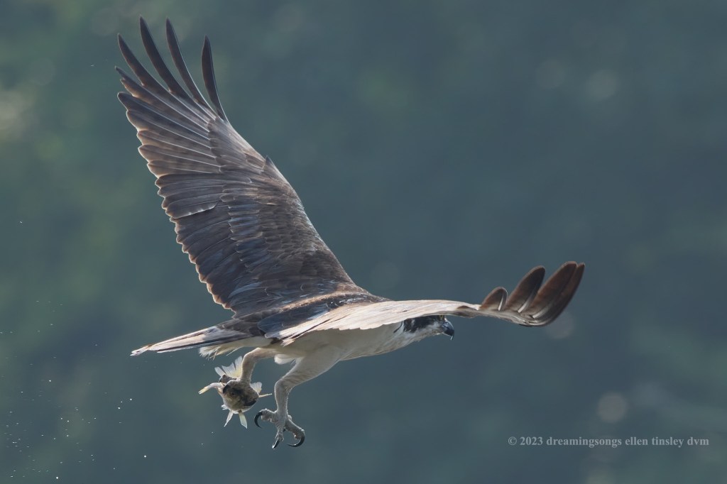 Jordan Lake Dam. The male osprey has caught two fish. I can’t tell you whether the small fish was in the process of being caught by the big fish when the osprey caught both fish. Or did the osprey’s talons catch the small fish as it’s talons caught the large fish. I don’t honestly know … an interesting puzzle.