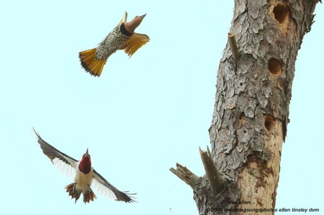Jordan Lake: I think “startling” is the best adjective for this display of a pair of yellow-shafted northern flickers this morning. The female is the one flying off to the right. The male had thought to visit with her, their chattering had filled the woods and the cove, but she had other thoughts. The golden-yellow color of the shafts is only seen when the flickers are in flight … making it a challenge to photograph them as they flicker about the woods.
