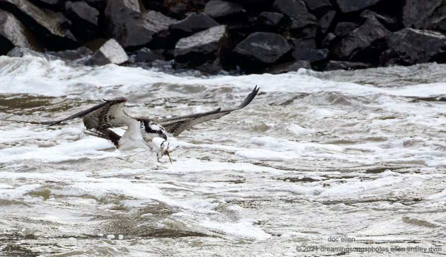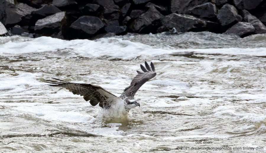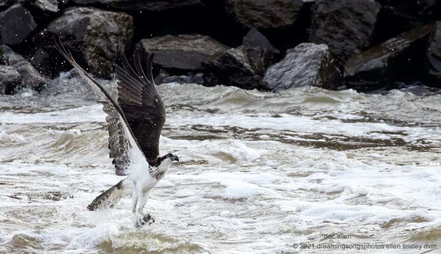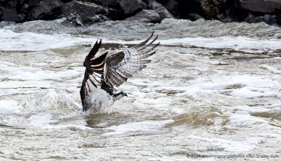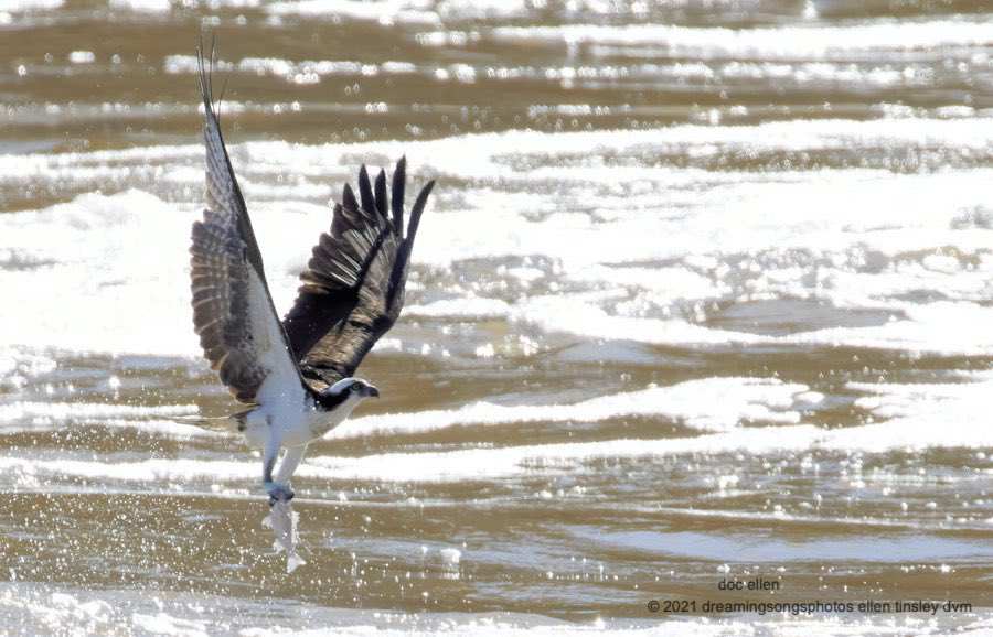 Jordan Lake Dam, Haw River: On a fishing dive, an osprey picks up a lot of water. Water is heavy at 8 pounds per gallon. The osprey is an efficient flyer so once it gains some height above the water, the bird does a shake to throw off the excess water and its weight. I love watching the shake start at the bird’s beak and finally flipping off at the end of its tail – just like a very wet dog. The bright morning light striking the scattering drops makes the osprey a sparkling sunburst.