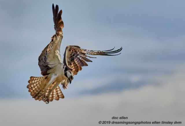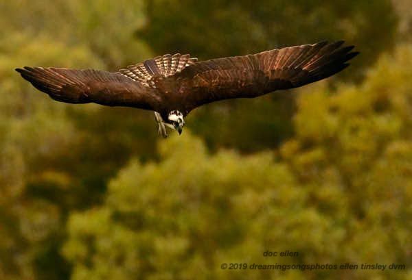 Mom osprey floated in over the north end of the dam and curved past the pine trees.