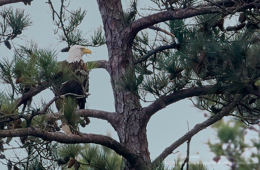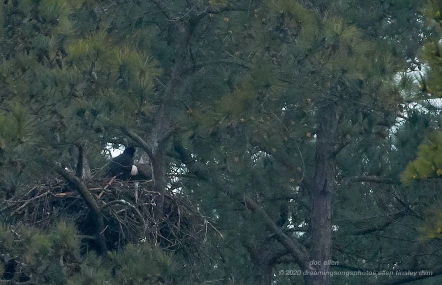 Bald Eagle Nest WARNING. There was a HUMAN INTRUSION at First Nest today. The intruder was on the shoreline almost beneath the nest, watching the nest and parents. Both parent eagles got very upset and left the nest. They left the eggs uncovered for more than 10 minutes. The scientists say that an egg, in the winter, left uncovered by the warmth of a parent bird for that long could very possibly die. Eventually Petruchio and then Kate returned, both still agitated and it took another 5 minutes before Kate settled on the eggs. PLEASE pass this warning along. 660 feet is the minimum distance a human can be from a bald eagle nest during breeding season. Please respect the bald eagles at Jordan Lake and where ever bald eagles decide to nest. NO sighting or photo is worth the loss of a single bald eagle. 1st photo is Kate, 2nd is Petruchio, both upset at the human intruder.