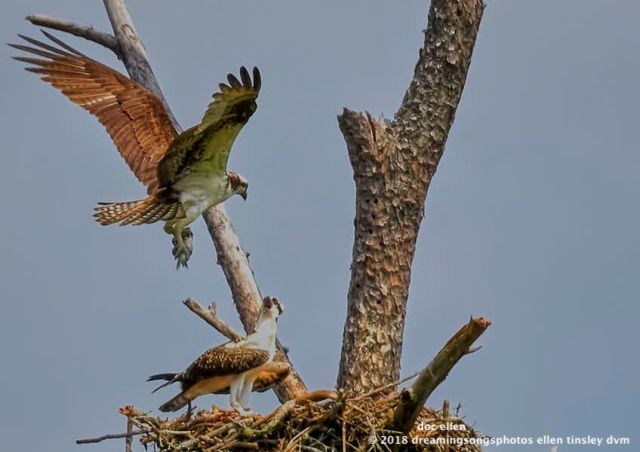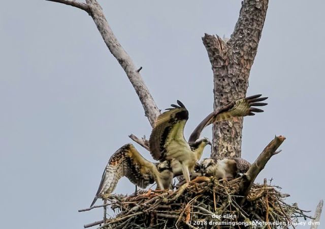Defiant! Broken Feather gets to the perch where we watched her learning to eat on a slippery slope.