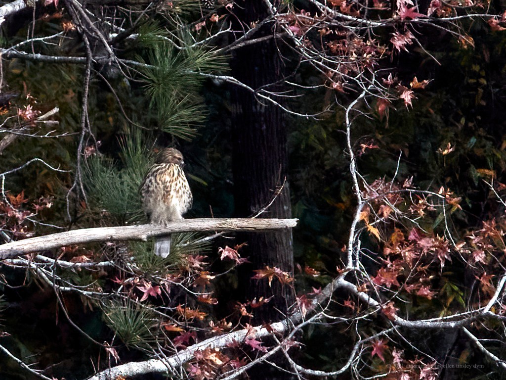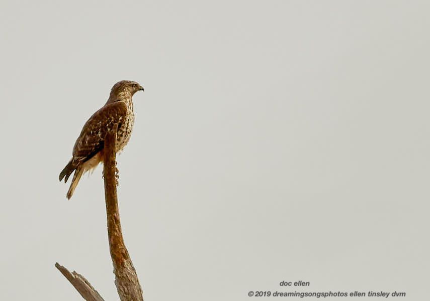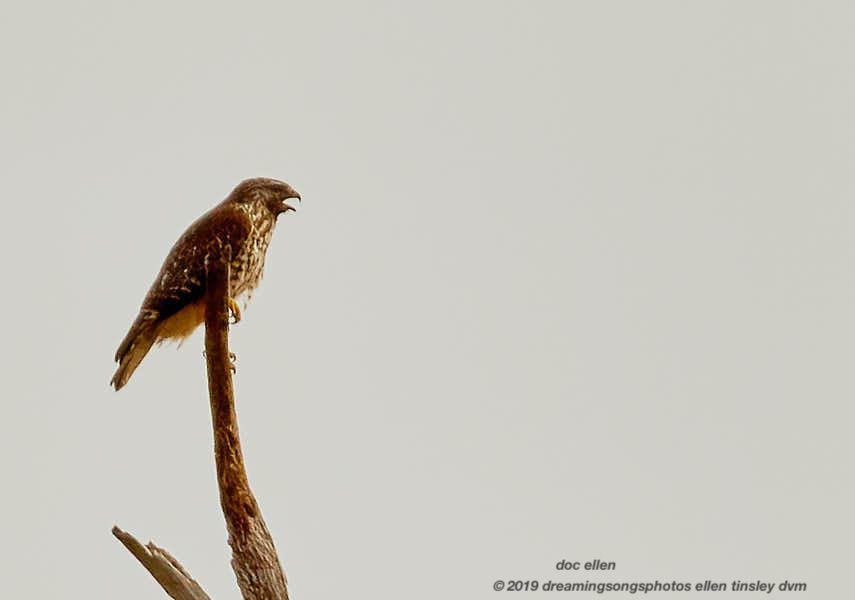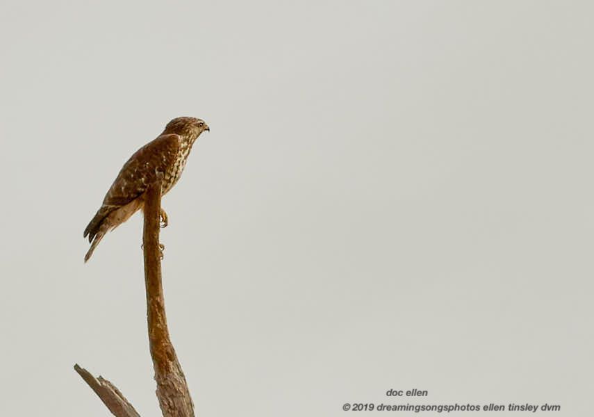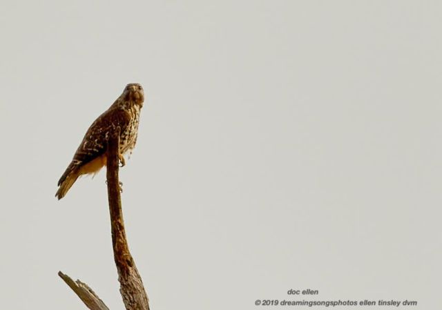 Here is a prime example of my father‘s favorite kind of temperature gauge. I photographed this red shouldered hawk yesterday morning when the wind chill factor was 35°F. Even if I had been sitting in my warm truck, I could have glanced over at this hawk and known that because he is almost as big around as he is tall … the air is cold. He has all of his feathers fluffed up as a nice warm blanket. Also note that he’s got his body lowered so that his feather blanket is mostly covering his feet … just like our warm winter slippers would do.