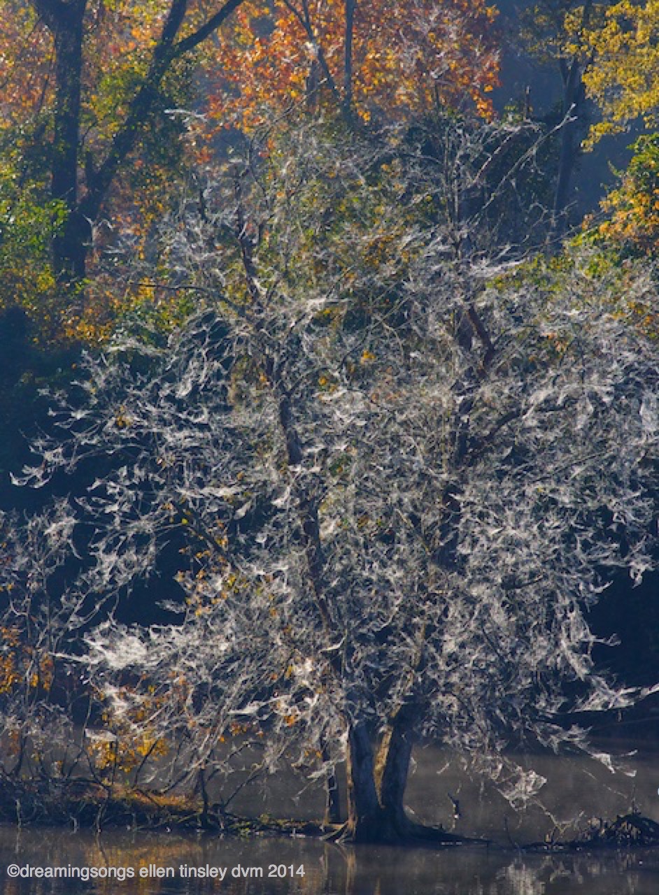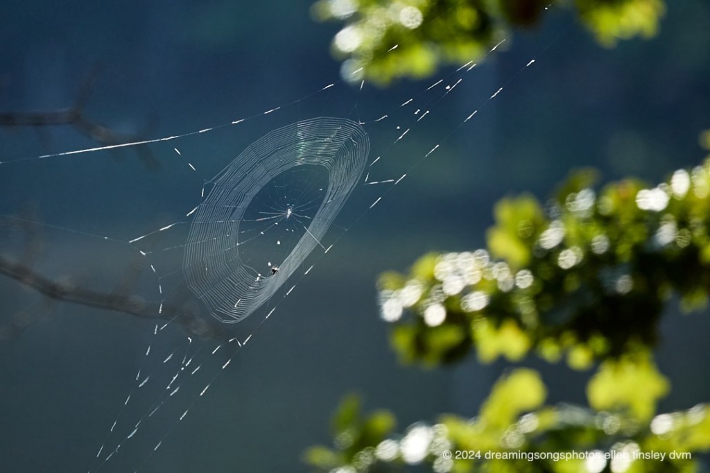 Jordan Lake. I had never seen a spider web which had anchor lines that looked like they were perforated to tear the line apart. I sent my photo over to the NC Museum of Natural Sciences, Ask a Naturalist tab. The entomologist told me that the web was built by an orb weaver and, get this, those thickened areas along the anchor lines – those dashes are spider silk tufts placed there by the spider as bird flags! So that birds will see the web and not fly through and destroy it. Who would’ve thought! Nature bedazzles me again.