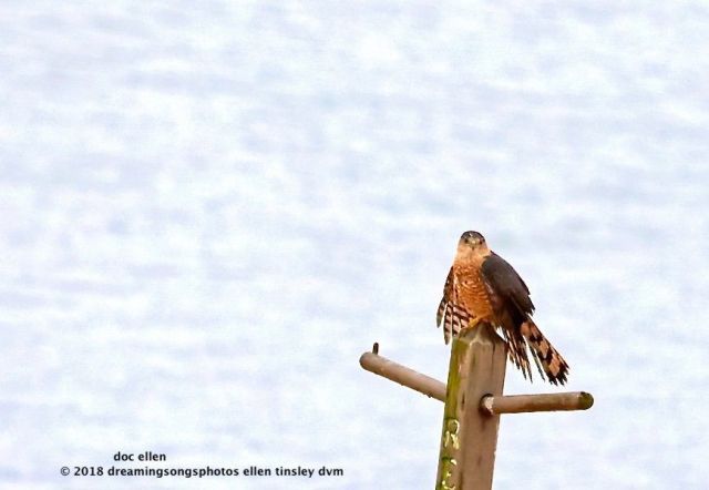 A very wet bedraggled Cooper’s hawk paused on a post to try to dry his feathers.