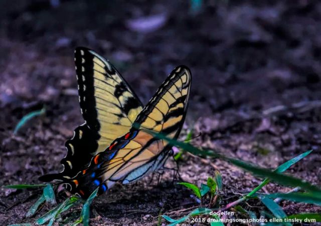 Jordan Lake. The eastern tiger swallowtail butterfly often gathers in large masses to feed upon the salt found in various muds. The salt is believed to be needed for reproduction. It is an awesome sight to see that many butterflies piled up in one place! Did you see the one butterfly get flattened and then jump right back up?
