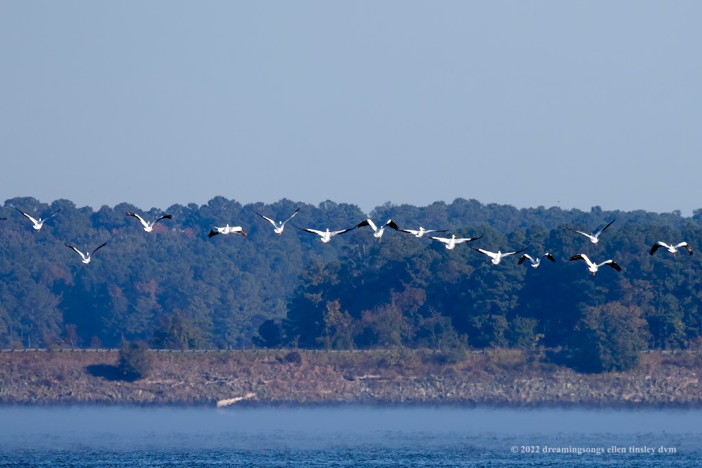 Jordan Lake. Oh my! I was watching bald eagles this morning and as the fog lifted I suddenly realized there was a rather large white mass of birds out on the lake. They were American white pelicans. I see a few here most winters December – January. I have never seen this many before. One of the birders who had a spotting scope counted them and there were 40. They are way off their normal migration course. Neat to see!