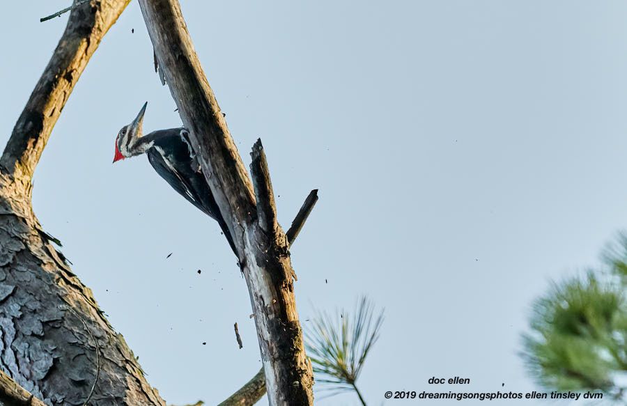I had heard this male pileated and his mate chipping away across the cove from me. I had gotten distracted by a fishing osprey, when two trees away from me the thwacking got very loud. Looking up I was startled at how close the woodpecker was to me as these birds tend to be spooky around people. I got the scattering of the wood chips as the pileated drew back for another blow – so fast it blurred my next shot of him. Then his mate called out and just like that he was gone into the deeper shadows.
