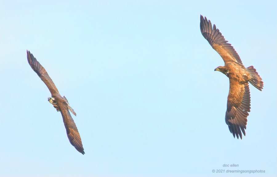 He has a fish, and out of sight is the 3 year old eagle chasing him, wanting to steal the yearling’s fish.