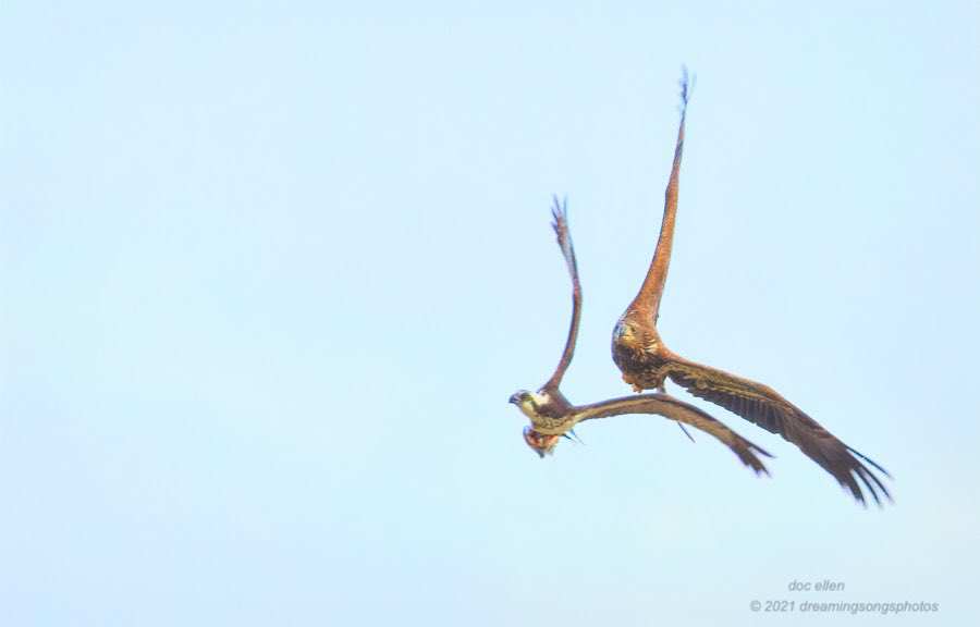 Jordan Lake Dam & Haw River: the riprap at the tailrace has become a traffic jam! There have been more than a dozen ospreys and 4-5 bald eagles all looking for fish. However, the bald eagle is a lazy hunter. In this case, an eagle, about 14 months old, had decided it wanted Mom osprey’s fish. The high speed chase lasted almost 2 minutes. The pursuit went from the dam to the south end of the riprap. Mom osprey dropped her fish at that point and the bald eagle went out over the playground and Mom osprey went looking for another fish in the riprap. This duel often happens where ever ospreys and bald eagles inhabit the same water ways. The photos also let you see the size difference between the two species.